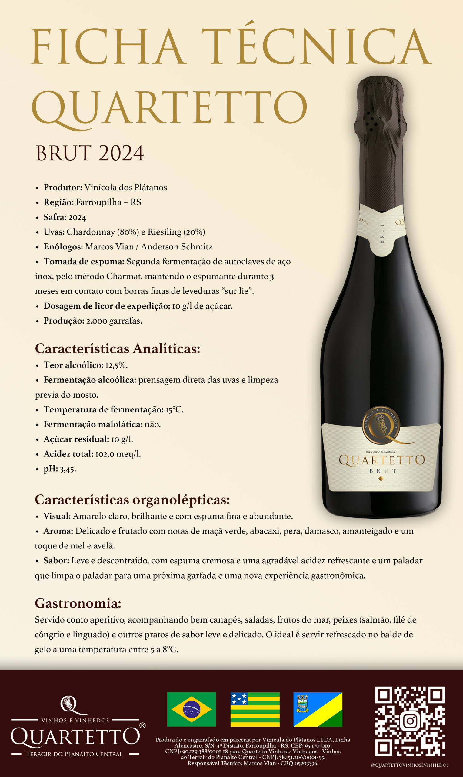 Espumante Branco Brut de perfil leve e elegante, com borbulhas finas e persistentes. Apresenta aromas delicados de maçã verde, abacaxi, pera e damasco, com um toque sutil amanteigado. Em boca, revela acidez vibrante, textura cremosa e um final equilibrado. Um espumante versátil, perfeito para brindar a leveza dos bons momentos.