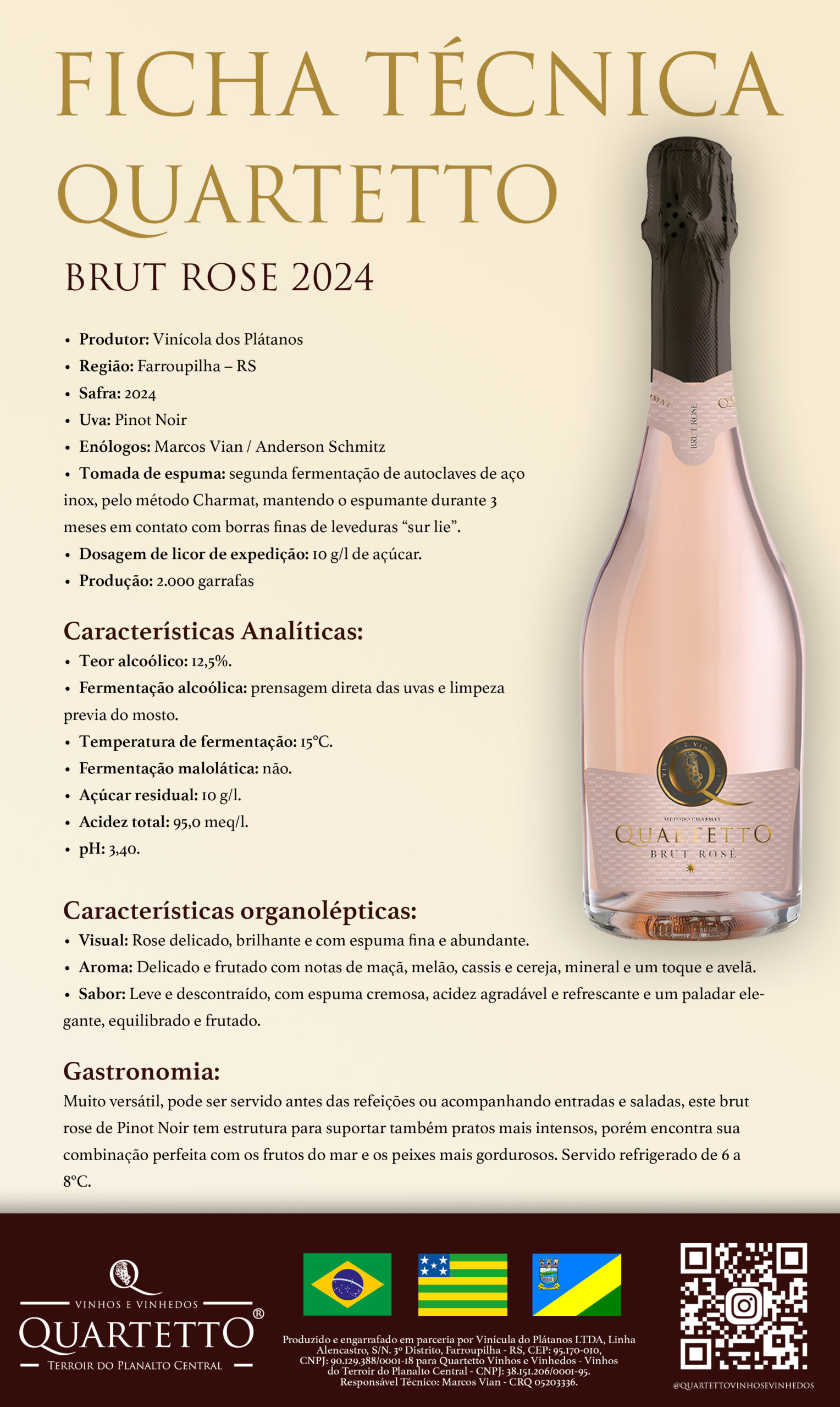 Espumante rosé leve e refrescante, com borbulhas finas e abundantes, aroma delicado de frutas como maçã, melão e cereja, e um toque mineral, no paladar é equilibrado com acidez marcante e boa cremosidade.